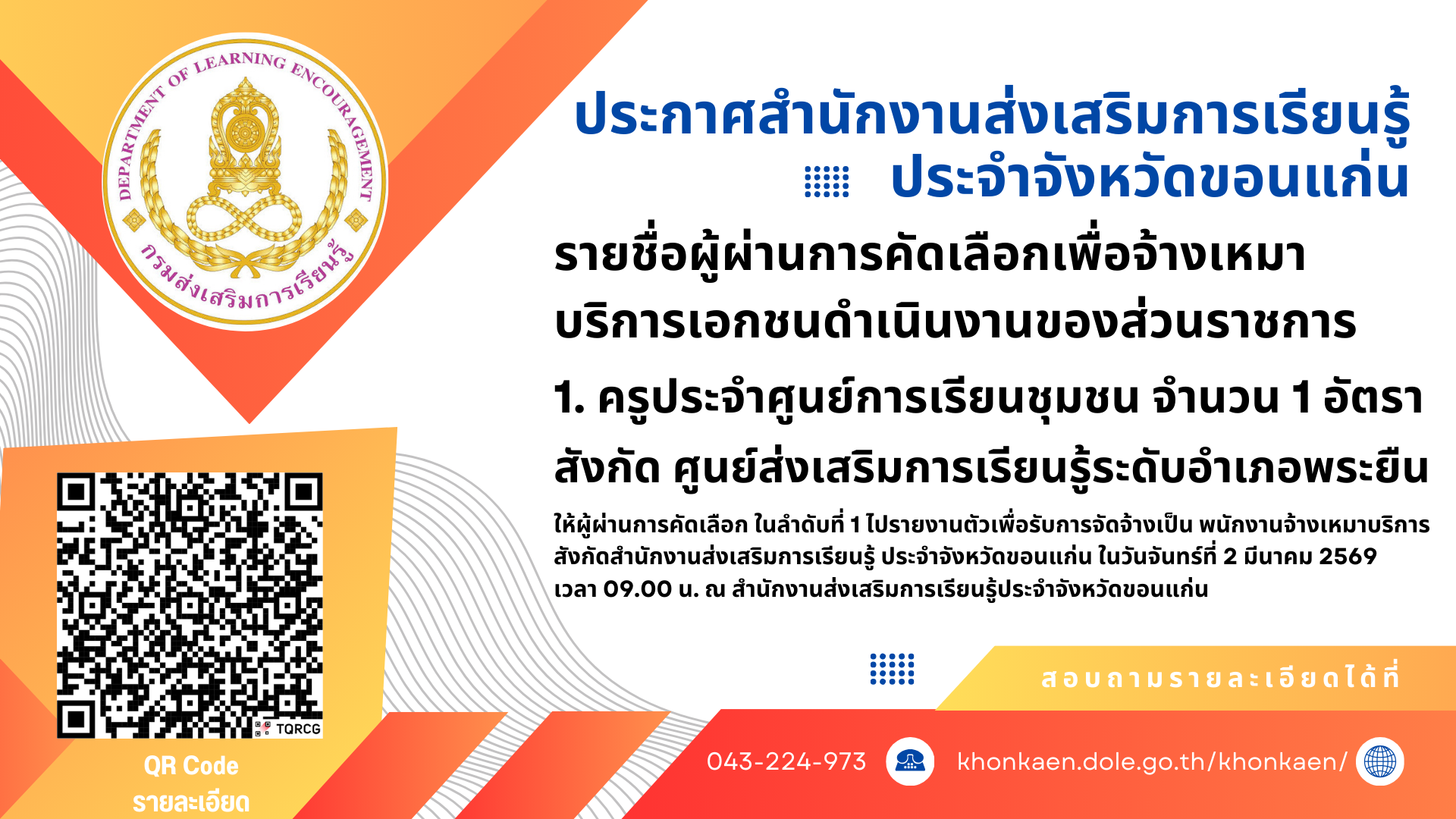 ประกาศรายชื่อผู้ผ่านการคัดเลือกเพื่อจ้างเหมาบริการเอกชนดำเนินงานของส่วนราชการ ตำแหน่ง ครูประจำศูนย์การเรียนชุมชน จำนวน 1 อัตรา สังกัด ศูนย์ส่งเสริมการเรียนรู้ระดับอำเภอพระยืน